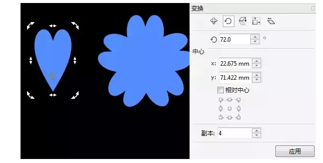 設計服裝吊牌的第二步: 旋轉復制 雙擊“矩形工具”繪制同文檔相同大小矩形, 為了方便我們看,將矩形填充為黑色,在工具箱中選擇“基本形狀”組中“完美形狀”中的“心形”圖案,繪制心形,復制旋轉心形角度,如圖所示。