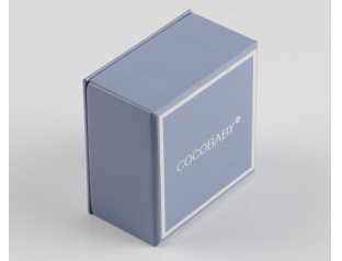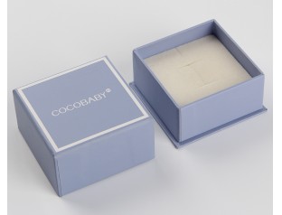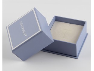 此款首飾盒包裝采用157g銅版紙裱1000g灰板,單色印刷,過啞膠,內盒置入雙層海綿內托。首飾天地蓋盒設計采用了淺藏藍色作為整體色,搭配白色的logo,給人 優雅又活潑 的視覺感。首飾紙盒置入成型的米白色海綿內托,與產品完全吻合,起到固定和美華的作用。