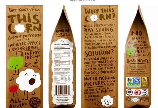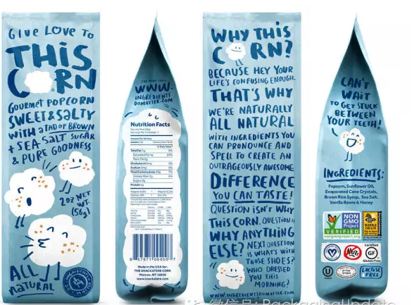 彼得·格雷格森工作室把手工風格融入到爆米花的包裝設計中,滑稽的插圖讓產品看起來非常的俏皮可愛。